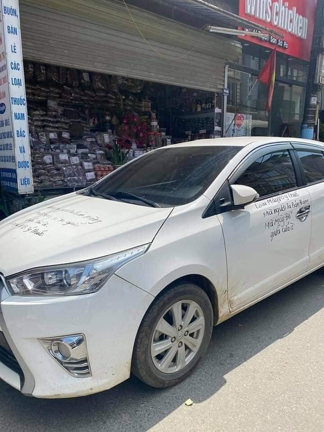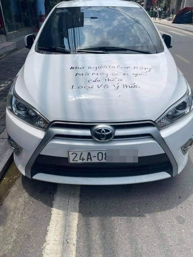Người này đã dùng bút viết lên nắp capo và cánh cửa ô tô: "Nhà người ta bán hàng, mà đỗ xe giữa cửa thế à? Loại vô ý thức"
