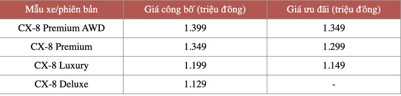 Cụ thể, giá 3 phiên bản CX-8 Luxury, Premium và Premium AWD sau ưu đãi còn 1,149 tỷ, 1,299 tỷ và 1,349 tỷ đồng. Khách mua xe còn được tặng thêm phụ kiện. Riêng bản Deluxe không giảm giá và phiên bản này hiện chưa có xe bán ra, đại lý vẫn nhận đặt cọc trước.