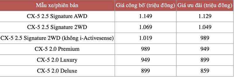 Mức giảm mạnh nhất 50 triệu áp dụng với phiên bản 2.0 Luxury, đưa giá xuống còn 899 triệu đồng. Các bản 2.0 Deluxe và 2.0 Premium sau khi giảm 40 triệu còn 859 triệu và 949 triệu đồng. Bản 2.5 Signature 2WD không có i-Activsense giảm 30 triệu còn 989 triệu đồng. Hai bản cao cấp nhất là 2.5 Signature 2WD và 2.5 Signature AWD giảm 20 triệu, còn lần lượt 1,049 tỷ và 1,129 tỷ đồng. Người mua xe được tặng thêm phụ kiện.