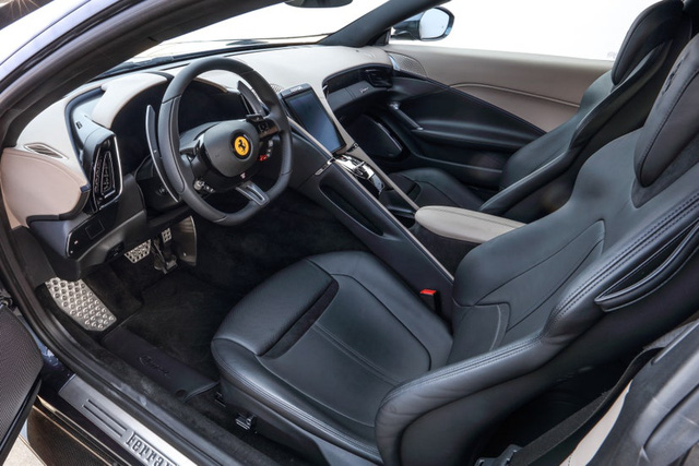 Nội thất Roma không chỉ khác ở việc bố trí chỗ ngồi so với các siêu xe khác mà còn mới lạ hơn ở thiết kế. Vô-lăng trông khá gọn gàng với các nút điều khiển cảm ứng. Phía sau là màn hình kỹ thuật số 16 inch. Ở giữa là màn hình 8,4 inch đặt dọc, hỗ trợ kết nối Apple CarPlay. Hệ thống âm thanh 6 loa.