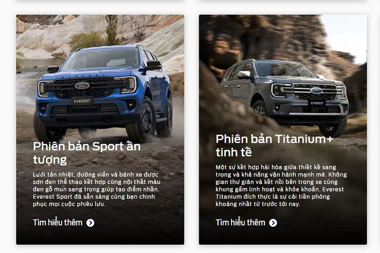 Theo thông tin từ website của hãng, mẫu xe Ford Everest 2023 sẽ được bán tại Việt Nam với các phiên bản Titanium+ (cao cấp) và Sport (tiêu chuẩn).