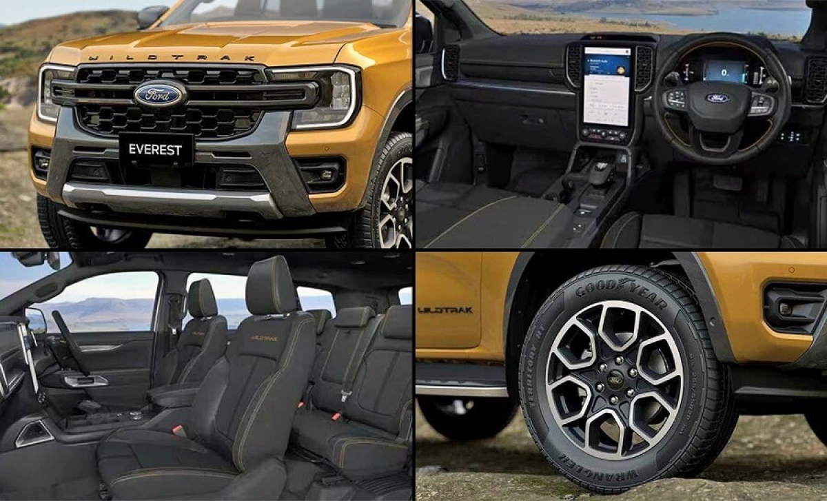 So với các phiên bản khác của Everest, Wildtrak 2023 nổi bật với lưới tản nhiệt khác biệt, cản trước, bệ cửa thép, đường viền mui xe và bộ la-zăng kích thước 20 inch riêng biệt. Dòng chữ Wildtrak được gắn ở nắp ca-pô, cốp sau và cửa trước sẽ giúp mọi người phân biệt với phiên bản khác. Phiên bản này cũng có lớp sơn màu vàng đồng đặc trưng giống với mẫu bán tải của hãng - Ranger Wildtrak.