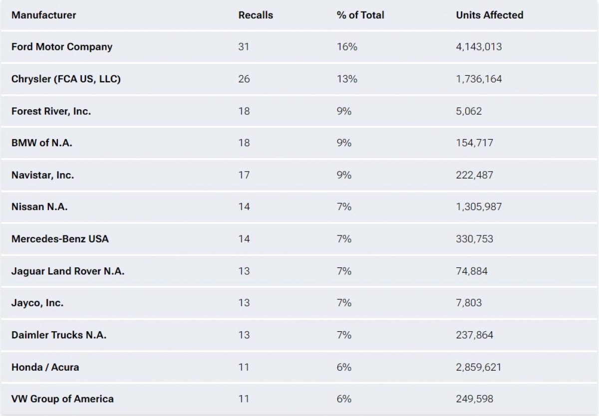 31 đợt triệu hồi của Ford ảnh hưởng đến tổng cộng 4,1 triệu xe, gần gấp đôi Stellantis và hơn BMW gần 4 triệu xe. Tuy nhiên, bất chấp số lượng triệu hồi lớn của các nhà sản xuất ô tô khác, Honda-Acura là nhà sản xuất có số xe bị ảnh hưởng nhiều thứ hai. Mặc dù hãng chỉ có 11 chiến dịch trong 6 tháng, nhưng chúng có khả năng tác động đến tổng số 2,8 triệu phương tiện.