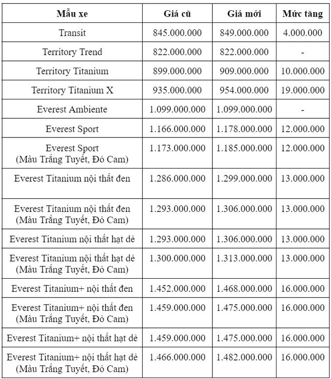 Mẫu SUV 7 chỗ "ăn khách" nhất Việt Nam ở thời điểm hiện tại - Ford Everest điều chỉnh giá theo hướng tăng từ 12 – 16 triệu đồng, tuỳ phiên bản. Trong đó, bản Titanium+ 2.0L AT 4x4 tăng 16 triệu đồng, đưa giá xe lên 1,468 tỷ đồng, bản Titanium 2.0L AT 4x2 tăng 13 triệu đồng, giá mới sẽ là 1,299 tỷ đồng, bản Sport 2.0L AT 4x2 tăng 12 triệu đồng, lên mức 1,178 tỷ đồng. Bản Ambient 2.0L AT 4x2 sẽ giữ nguyên giá cũ 1,099 tỷ đồng. Mức tăng cao nhất trong đội hình sản phẩm của Ford ở đợt điều chỉnh giá bán lần này là Ford Explorer với 40 triệu đồng. Sau điều chỉnh, giá niêm yết của Explorer nằm ở mức 2,439 tỷ đồng. Mẫu xe này hiện được phân phối tại Việt Nam với một phiên bản.