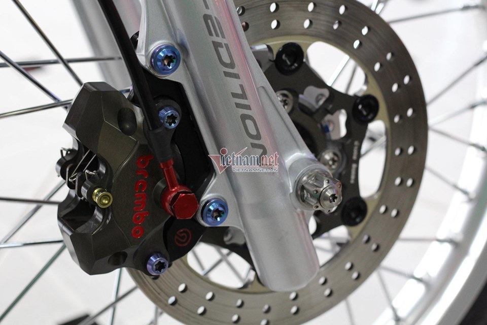 Bên cạnh đó, xe được trang bị cặp vành Excel. Hệ thống phanh trước của chiếc xe cũng được nâng cấp triệt để với thắng hiệu Brembo RCS và heo Billet. Ở phía sau, thay đổi nổi bật là cặp phuộc lò xo đôi Ohlins hàng hiệu.