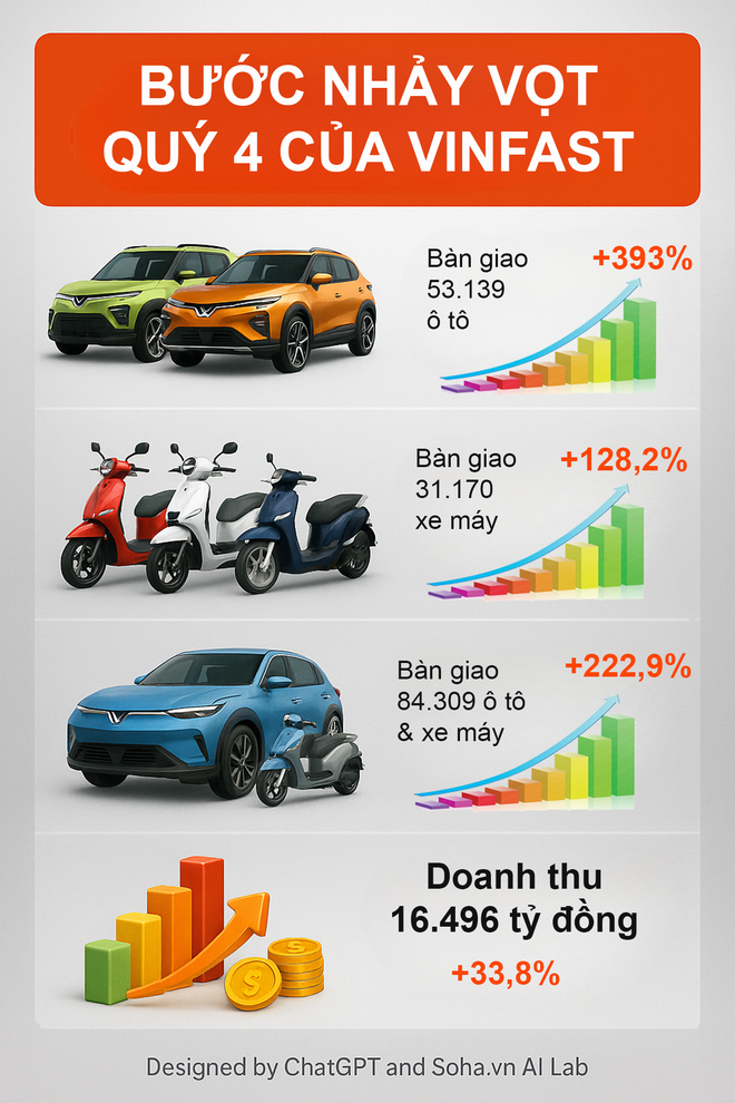 Riêng Quý IV/2024, VinFast giao 53.139 ô tô điện (tăng 393 %) và 31.170 xe máy điện (tăng 128,2 %), tổng 84.309 xe (+222,9 %). So với quý liền trước, doanh số ô tô điện tăng 143 %, xe máy điện tăng 65 %.
