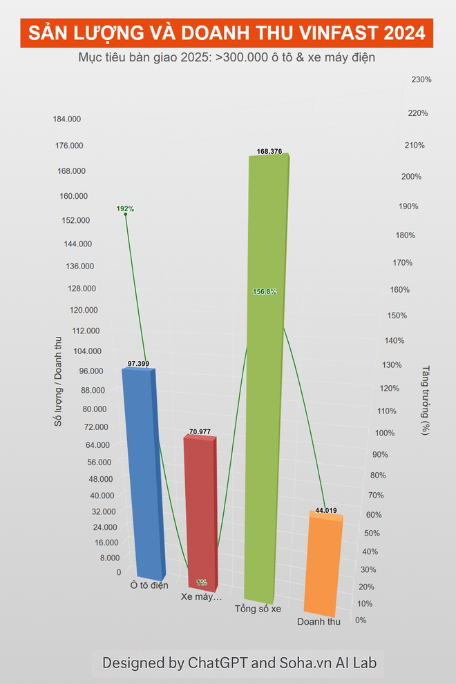 Mới đây, VinFast công bố báo cáo tài chính chưa kiểm toán quý IV và cả năm 2024. Cả năm, hãng bàn giao 168.376 xe, gồm 97.399 ô tô điện (tăng 192 % so với 2023) và 70.977 xe máy điện (tăng 1 %). Tổng số xe bàn giao cả năm tăng 156,8 % so với cùng kỳ trước.