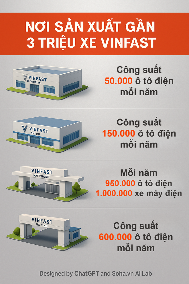 Để hiện thực hóa mục tiêu, VinFast đẩy nhanh tiến độ các nhà máy mới tại Indonesia (công suất 50.000 xe/năm) và Ấn Độ (150.000 xe/năm). Tổ hợp ở Hải Phòng có khả năng 950.000 ô tô và 1.000.000 xe máy điện mỗi năm, trong khi nhà máy Hà Tĩnh dự kiến vận hành sớm với công suất 600.000 xe/năm.