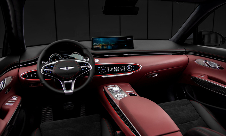 Trong cabin, chủ đề oval ngự trị khắp nơi, từ hệ thống điều khiển hay chỗ tay nắm cửa. Màn hình thông tin giải trí cỡ lớn đứng trên táp-lô, các núm xoay ở bảng điều khiển trung tâm giữa hai ghế trước. Vô-lăng hai chấu trên bản tiêu chuẩn và 3 chấu ở bản Sport. Xe gồm hai hàng ghế với 5 chỗ, trong khi GV80 có tùy chọn hàng ghế thứ 3.