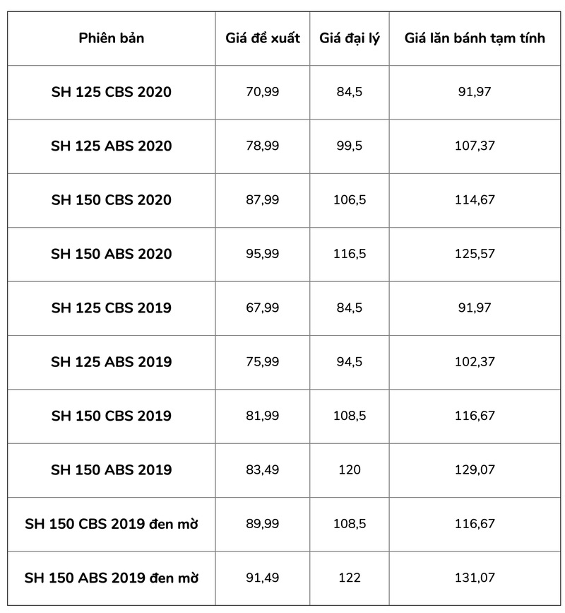 Hiện nay giá xe Honda SH 150 tại một số đại lý Honda tại Hà Nội như sau: