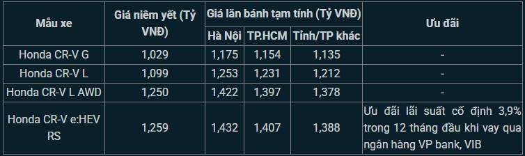 Giá niêm yết và lăn bánh tạm tính xe Honda CR-V cập nhật tháng 5/2025: