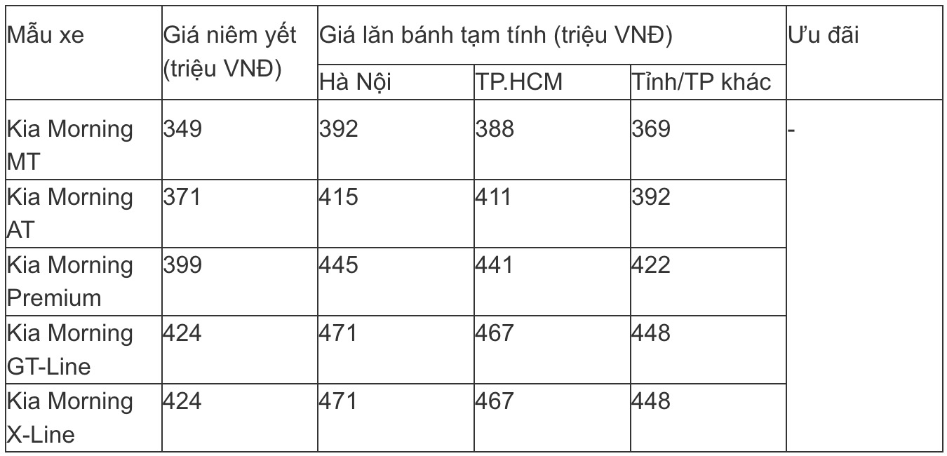 Giá lăn bánh Kia Morning mới nhất