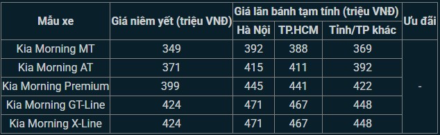 Tham khảo giá niêm yết và lăn bánh xe Kia Morning cập nhật mới nhất tháng 5/2025: