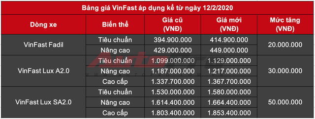 Hiện tại, VinFast Fadil có giá niêm yết từ khoảng 415 triệu đến 449 triệu đồng. Giá Lux A2.0 dao động từ 1,129 tỷ đến 1,368 tỷ đồng, với 3 phiên bản. Mẫu Lux SA2.0 cũng có 3 phiên bản, giá niêm yết từ 1,58 tỷ đến 1,853 tỷ đồng.