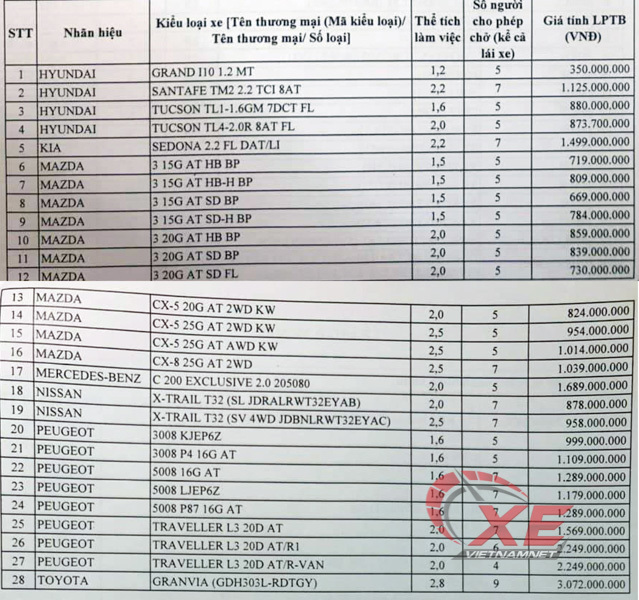 Ba mẫu xe Hyundai được điều chỉnh, bổ sung giá tính lệ phí trước bạ gồm Grand i10 1.2 MT giá mới là 350 triệu đồng, SantaFe TM2 2.2 TCI 8AT giá 1,125 tỷ đồng, Tucson TL1-1.6GM 7DCT FL giá 880 triệu đồng và Tucson TL4-2.0R 8AT FL 873,7 triệu đồng.