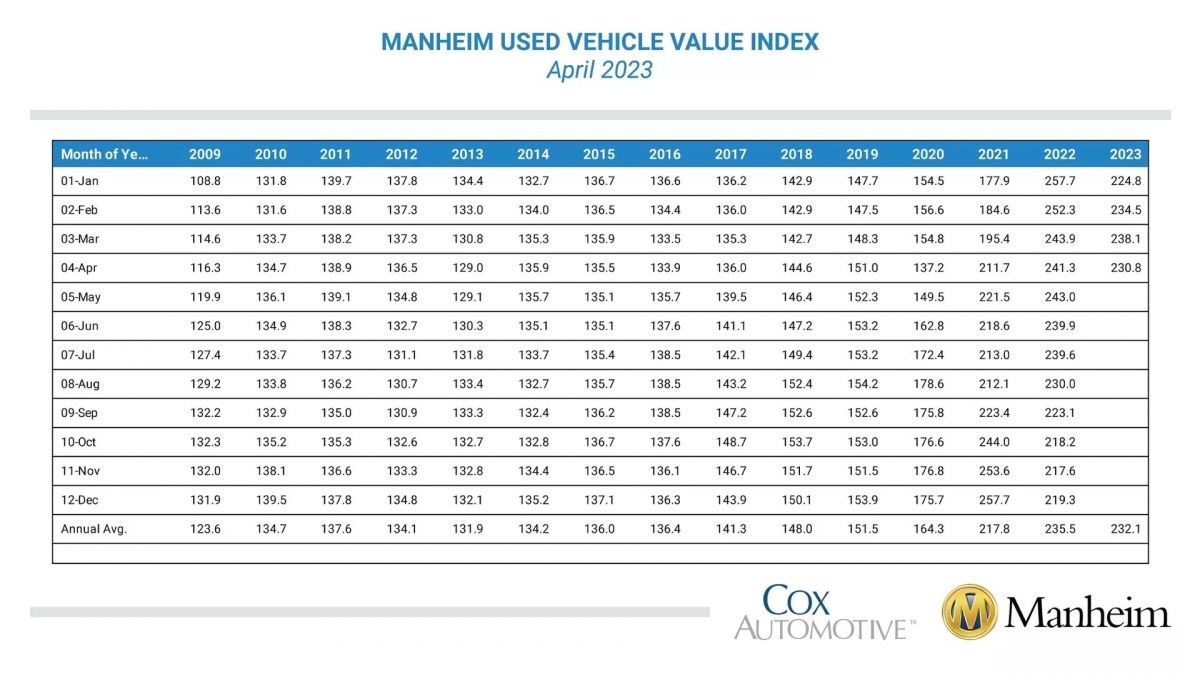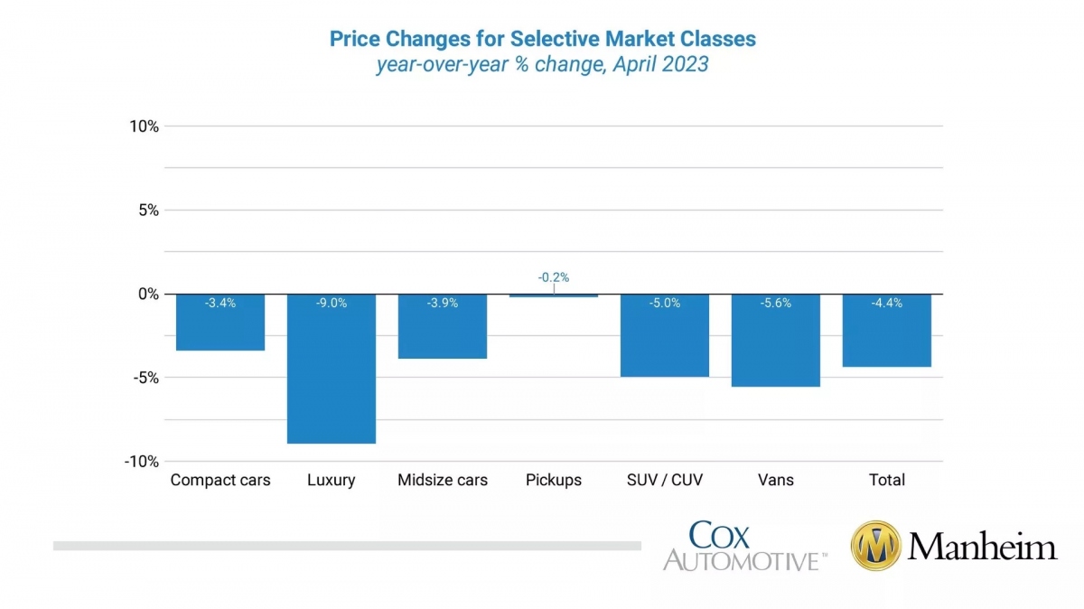 Theo báo cáo mới nhất của Mannheim Consulting, nơi theo dõi các giao dịch xe đã qua sử dụng bán buôn, giá trung bình của xe đã qua sử dụng ở Mỹ trong tháng 4/2023 đã giảm 3% so với tháng trước và 4,4% so với cùng kỳ năm ngoái.
