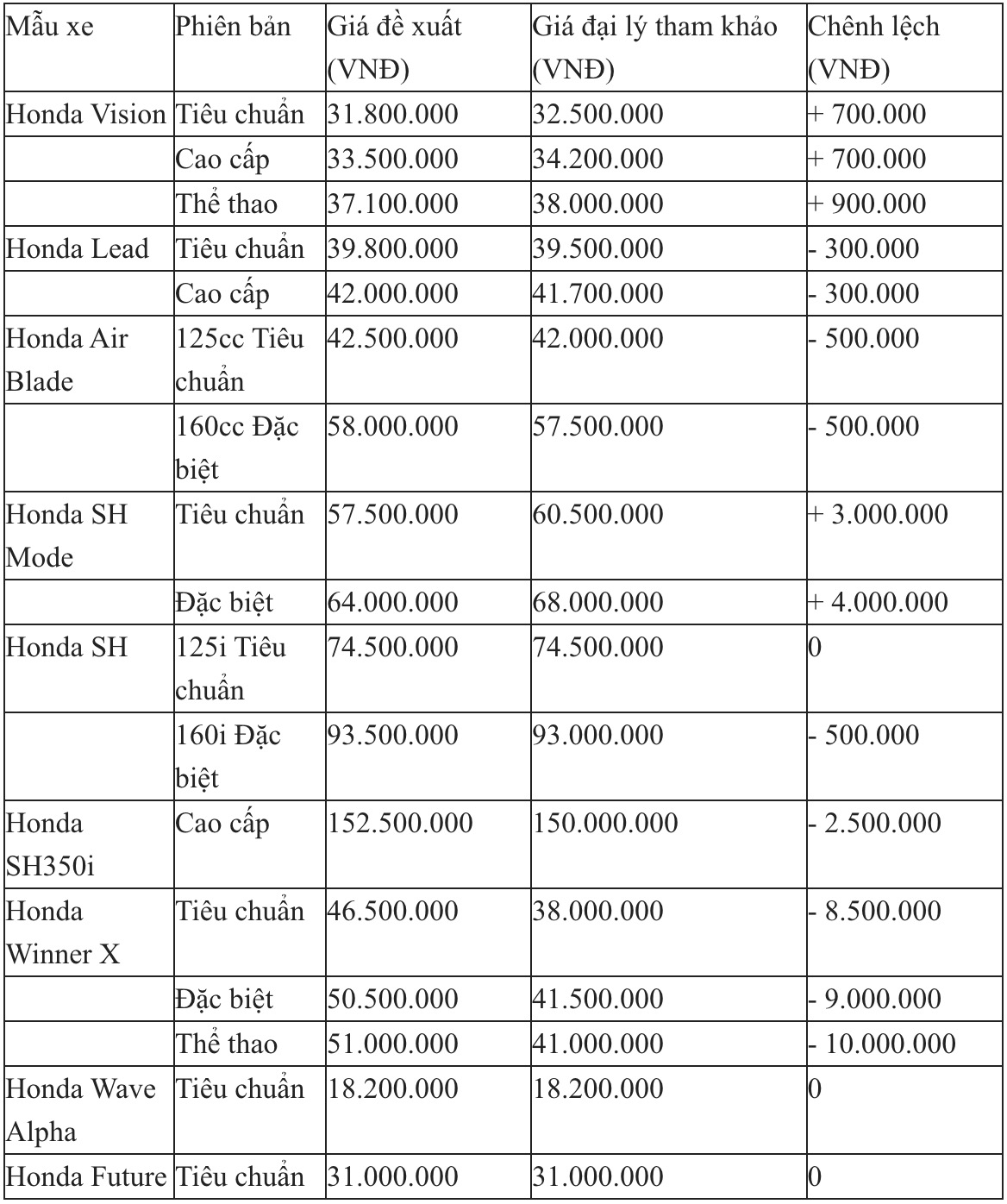 Cụ thể, giá tham khảo tại đại lý cho thấy Vision Thể thao khoảng 38 triệu đồng, SH Mode Đặc biệt khoảng 68 triệu đồng, và SH350i Cao cấp chỉ còn khoảng 150 triệu đồng, trong khi Winner X phiên bản Thể thao chỉ còn khoảng 41 triệu đồng so với giá niêm yết 51 triệu đồng; riêng các dòng xe số như Wave Alpha và Future vẫn giữ giá ổn định và bám sát giá đề xuất.