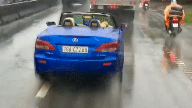 Mới đây, trên mạng xã hội xuất hiện đoạn clip ghi lại cảnh một chiếc ô tô mui trần đi giữa trời mưa mà không đóng mui gây chú ý. Theo hình ảnh ghi lại được thì chiếc xe đang di chuyển trên đường quốc lộ, trời mưa khi đó khá lớn khiến cần gạt mưa của chiếc xe phía sau gạt liên tục. Bên cạnh đó, nước từ bánh các xe tải phía trước cũng bắn mạnh về phía chiếc xe mui trần.