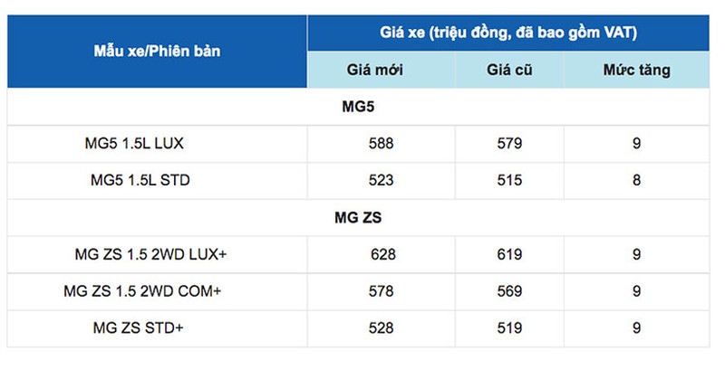 Mức tăng giá xe MG tại Việt Nam thấp nhất thuộc về phiên bản MG5 1.5L STD, tăng 8 triệu đồng. Sau phiên điều chỉnh mới nhất, giá xe MG5 sẽ không còn nằm trong khoảng 515 - 579 triệu đồng, mà đã thành 523 - 588 triệu đồng.