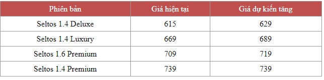 Cụ thể, theo dự kiến, sẽ có 3 phiên bản Seltos tăng giá trong đợt tới. Bản Seltos 1.4 Deluxe tiêu chuẩn tăng giá từ 615 triệu lên 629 triệu đồng. Bản Seltos 1.4 Luxury tăng giá từ 669 triệu lên 689 triệu đồng. Một phiên bản vừa được mở bán cách đây hơn một tháng là Seltos 1.6 Premium cũng tăng giá từ 709 triệu lên 719 triệu đồng. Chỉ có bản Seltos 1.4 Premium giữ nguyên giá 739 triệu đồng. Như vậy, mẫu xe này tăng giá cao nhất 20 triệu đồng.