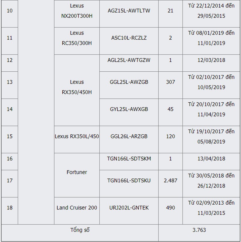Theo Công ty Ô tô Toyota Việt Nam, có 3.763 xe nhập khẩu nguyên chiếc là Lexus, Land Cruiser 200, Alpard, Fortuner và 29.513 xe Toyota Việt Nam sản xuất là Camry, Corolla, Innova cũng đều mắc lỗi cụm bơm nhiên liệu.