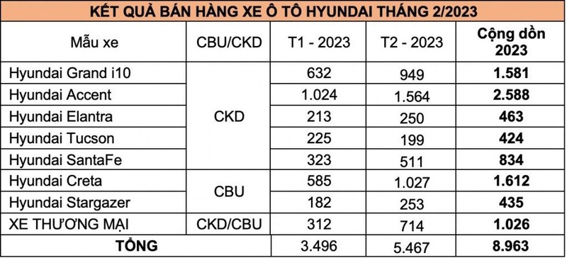 Cụ thể, trong tháng 3 vừa qua Hyundai giao đến tay khách hàng tổng cộng 5.773 xe, tăng trưởng nhẹ so với doanh số 5.467 xe đạt được trong tháng 2/2023. Những năm gần đây, thương hiệu Hyundai tại Việt Nam cạnh tranh ngang ngửa với Toyota trong cuộc đua trở thành thương hiệu bán chạy nhất tại thị trường. Sự lớn mạnh của Hyundai trông cậy hoàn toàn vào dàn xe chủ lực gồm Hyundai Accent, Hyundai Creta, Hyundai Stargazer,...