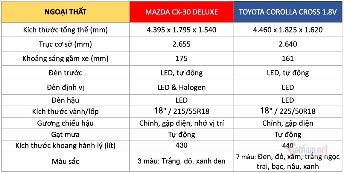 Nhìn tổng thể, Toyota Corolla Cross có phần “đồ sộ” hơn với kích thước Dài x Rộng x Cao là 4.460 x 1.825 x 1.620mm, còn kích thước của Mazda CX-30 lần lượt là 4.395 x 1.795 x 1.540. Khoang hành lý phía sau của Corolla Cross cũng lớn hơn Mazda CX-30 một chút (440 lít so với 430 lít).