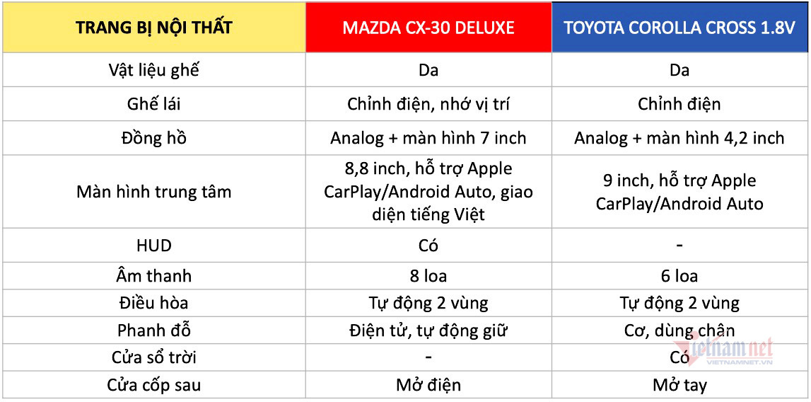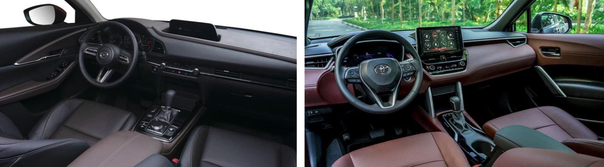 Do có kích thước lớn hơn nên khoang nội thất của Toyota Corolla Cross được đánh giá là rộng rãi hơn một chút so với đối thủ CX-30. Ở phiên bản Corolla Cross 1.8V cũng được trang bị cửa sổ trời, trong khi đó phiên bản Deluxe của Mazda CX-30 không có.