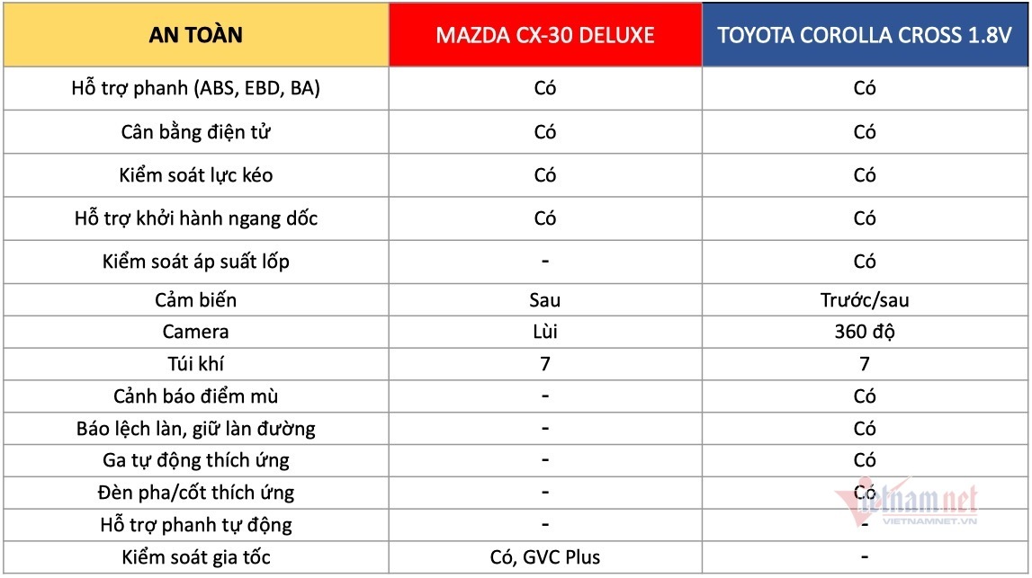 Với các mẫu xe mới nhất của mình, hãng Toyota và Mazda đã trang bị lên hàng loạt tính năng an toàn mang bản sắc riêng. Ở CX-30 là gói an toàn cao cấp i-Activsense còn với Corolla Cross là Toyota Safety Sense.