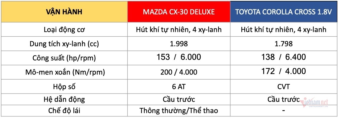 CX-30 sử dụng khối động cơ 2.0 lít, sản sinh công suất tối đa 153 mã lực và mô-men xoắn cực đại 200 Nm. Trong khi đó, Corolla Cross 1.8V sử dụng động cơ 1.8 lít, cho công suất tối đa 138 mã lực mà mô-men xoắn cực đại 172 Nm. CX-30 sử dụng hộp số tự động 6 cấp, trong khi đó Corolla Cross 1.8V sử dụng hộp số vô cấp CVT.