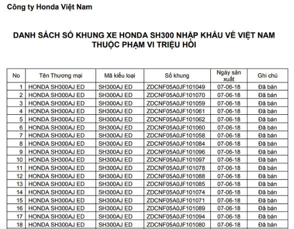 Theo đó, tổng cộng có đến 1.332 chiếc Honda SH300i thuộc đời 2018 -2019 bị triệu hồi để khắc phục lỗi này. Các xe bị ảnh hưởng có thời gian sản xuất từ tháng 6/2018 đến ngày 2/2020.