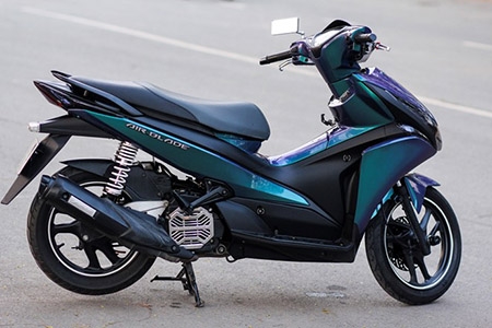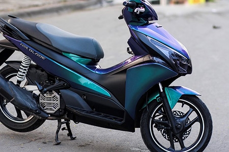 Chiếc Honda Air Blade 110 nguyên bản màu đỏ. Do kiểu dáng trông khá già nên chủ nhân của nó quyết định độ lại màu sơn có thể chuyển màu theo góc nhìn. |
