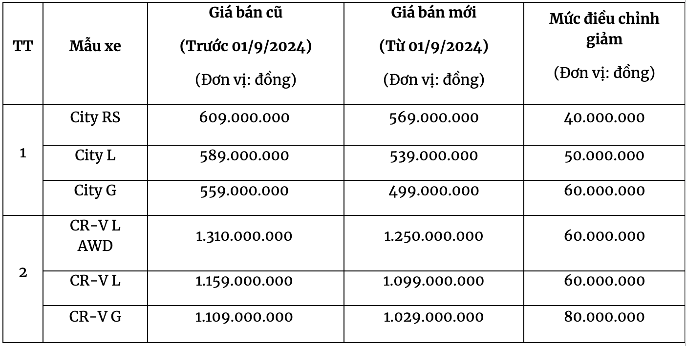Từ ngày 1/9, Honda City có giá đề xuất mới 499-569 triệu đồng, giảm 40-60 triệu đồng. CR-V có giá đề xuất mới 1,029-1,250 tỷ đồng, giảm 60-80 triệu đồng. Đợt điều chỉnh giá lần này không bao gồm CR-V phiên bản e:HEV RS (động cơ hybrid).