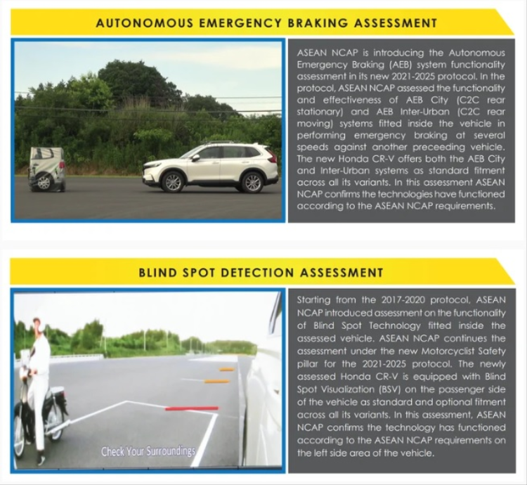 Các tính năng an toàn hoạt động hiệu quả với 18,57 điểm. Đối với hạng mục an toàn cho người điều khiển xe máy đạt 9,05 điểm trên tổng số 16 điểm. Kết quả cuối cùng, Honda CR-V mới đạt được là 87,16 điểm, xuất sắc giành chứng nhận an toàn 5 sao.