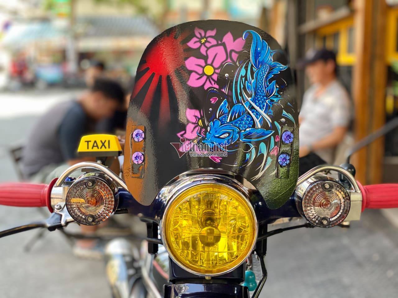 Riêng phần yên, mu rùa (ốp đuôi) và yếm xe là của dòng Cub Cubra khá hiếm được anh đặt từ Nhật về và sơn lại trùng màu sơn zin của xe với giá hết khoảng 4,4 triệu đồng.