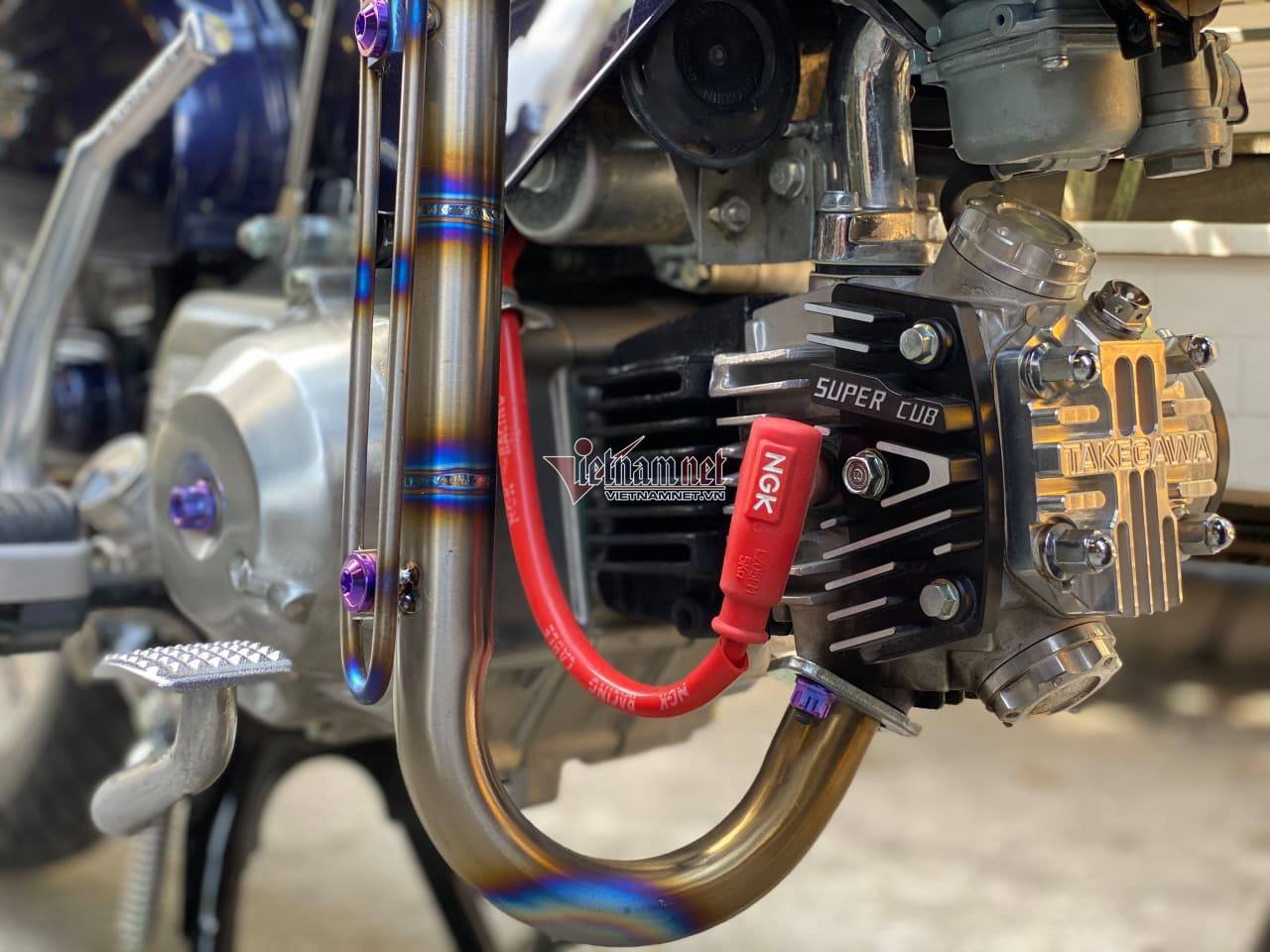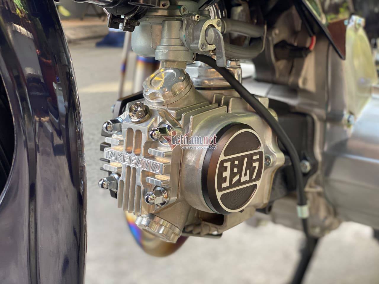 Trong đó, loạt đồ chơi cơ bản được anh đầu tư cho chiếc xe gồm pô xe Takegawa Track Road và cổ pô Titan giá 9 triệu đồng; cần khởi động Takegawa hơn 3 triệu đồng; chụp xi nhan và chụp đèn hậu cũng thuộc hiệu Takegawa giá 1,6 triệu đồng; đèn pha trước màu vàng của MiniMoto 1,5 triệu đồng; tay thắng Takegawa 550 nghìn đồng; nắp cánh bướm, nắp tròn, nắp 4 lỗ, nắp supap tiện CNC (chi tiết ngay đầu cục máy) giá 2,4 triệu đồng; dàn chân của xe cũng được trang bị niềng Excel, căm Nova và vỏ Michelin với tổng mức giá khoảng 3,3 triệu đồng.