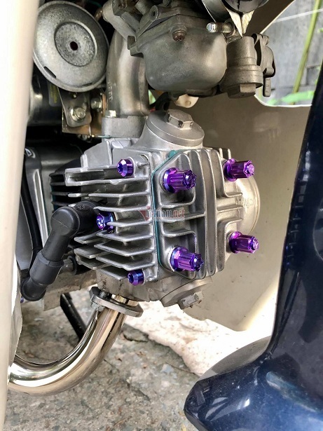 Một số chi tiết phụ tùng đắt giá, "dọn" lên xe được anh Công liệt kê như: phuộc Takegawa Bilet 12,9 triệu, pô cổ chai Takegawa 8 triệu, càng thắng Takegawa 2 triệu, niềng Excel, căm Nova, gác chân và cần số Cub C125, dàn ốc Titan full toàn bộ xe... Cùng với đó, anh Công cũng nâng cấp động cơ xe từ 70cc, hộp số 3 cấp lên 100cc, hộp số 4 cấp.