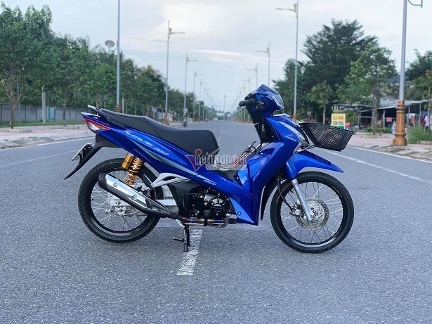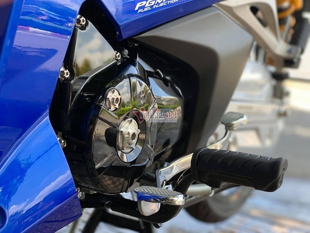 Với chiếc xe này, anh Hải không chọn cách dọn full đồ mà chỉ trang bị một số chi tiết mới cho xe như cặp phuộc Ohlins, một thương hiệu thường chỉ thấy trên những mẫu mô tô phân khối lớn. Thêm vào đó là cặp vành Excel. Phần đầu xe được trang bị mặt nạ mới, gắn thêm giỏ hàng màu đen, một trong những trang bị mang đậm phong cách Thái Lan. Xe cũng được khoác lên mình bộ "áo" mới màu xanh nổi bật.