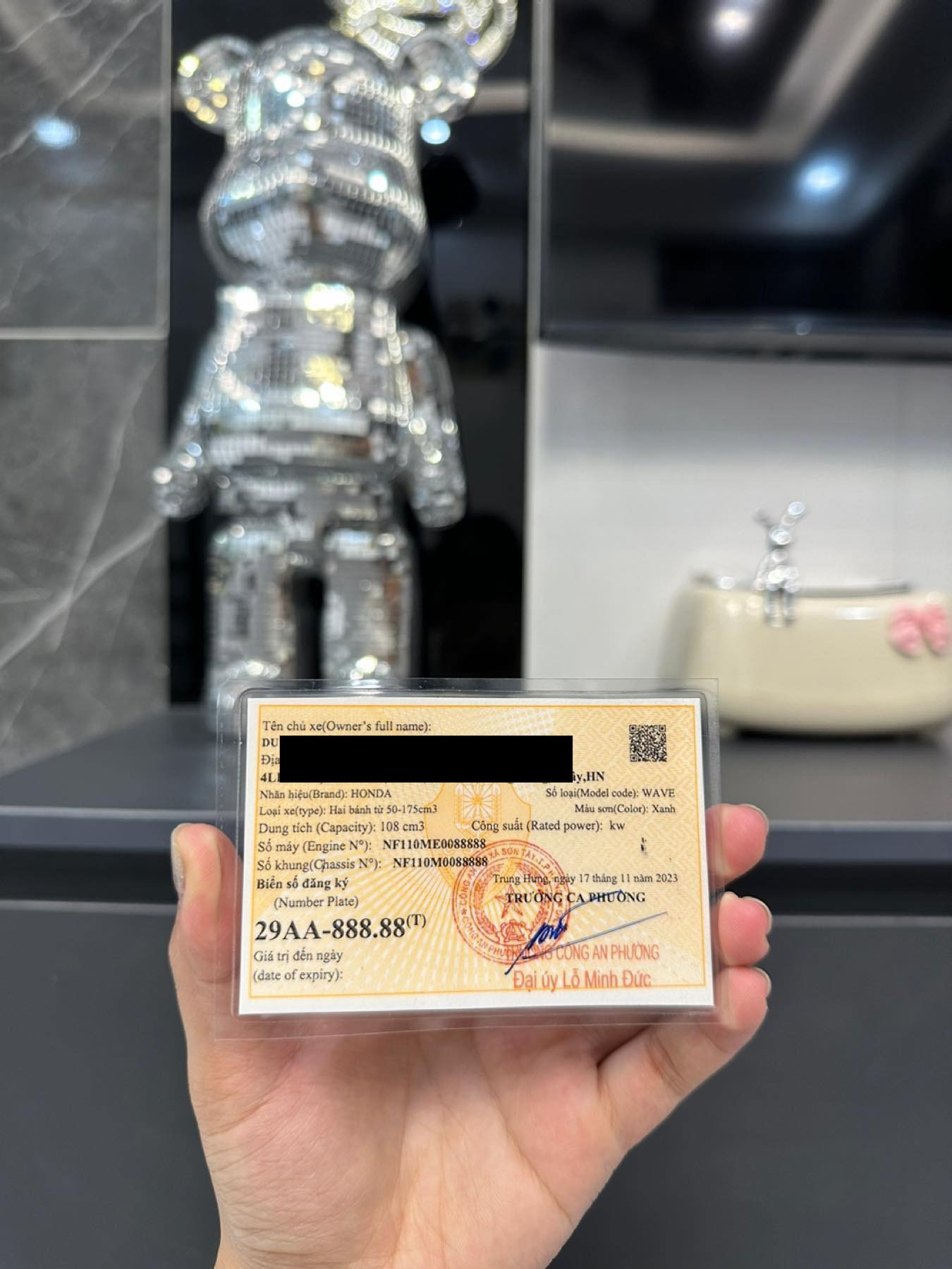 Đến nay, biển số này đã nâng lên một "tầm cao mới" khi được anh Toàn làm thủ tục định danh, thu hồi và gắn sang xe máy số Honda Wave 110cc nhập Thái, vốn rất "hot" trên thị trường. Đáng chú ý, chiếc xe này còn có số khung, số máy trùng nhau, đều là ngũ quý 8. Cụ thể, xe có số máy NF110ME0088888; số khung NF110M0088888.