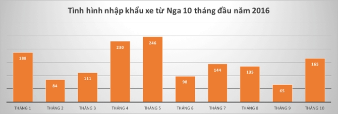 Trong tháng 10/2016, Việt Nam nhập 165 ô tô nguyên chiếc từ Nga, nhiều hơn tháng 9 khoảng 100 chiếc. Song so với nhiều tháng trước đó thì con số này chưa đáng kể, dù được hưởng thuế nhập khẩu 0%.