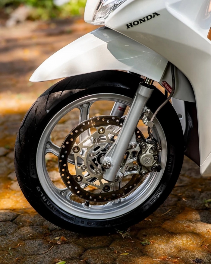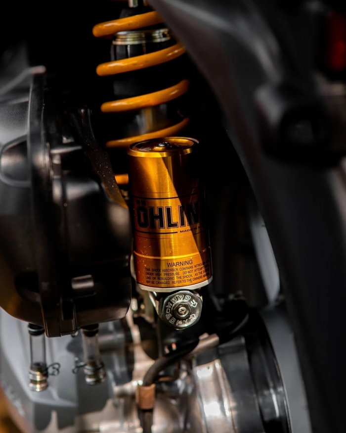 Không chỉ được lắp ráp bằng các món phụ tùng chính hãng từ Honda Vision tại Việt Nam, chiếc Spacy còn sở hữu nhiều món đồ chơi nhập khẩu như bộ gù lái nhập Ý, phuộc sau Ohlins HO 545, heo Brembo 2 piston, bracket CNC 267mm, đĩa phanh BG Performance, cùng dây dầu HEL…