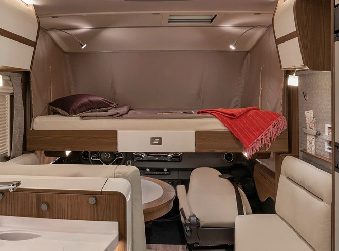 HYMER từng nhận được Giải thưởng Thiết kế Đức năm 2020. Vì thế, dễ hiểu vì sao không gian bên trong chiếc B-Klasse MasterLine I được sắp xếp rất lý. Xe có đủ buồng ngủ, nhà tắm, nhà vệ sinh, nhà bếp, phòng khách, khoang chứa đồ cồng kềnh bên ngoài xe cùng rất nhiều tủ và ngăn chứa đồ bên trong.