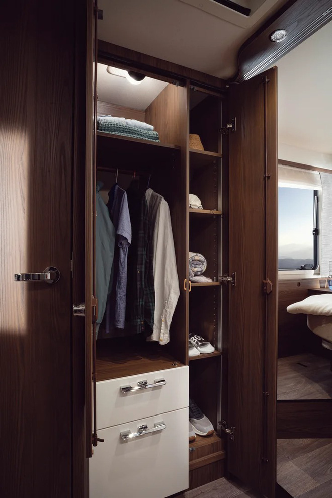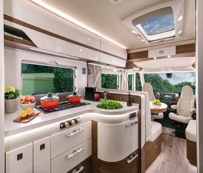 Khoang bếp đủ tiện nghi với bếp, bồn rửa, vòi nước, ngăn chứa bát đĩa, tủ đựng gia vị hoặc đồ ăn cùng tủ lạnh 153 lít và lò vi sóng. Tiếp đến là buồng tắm đứng, nhà vệ sinh và bồn rửa mặt riêng biệt. Bên trong bố trí tủ quần áo và rất nhiều ngăn chứa đồ nhỏ ở dưới sàn và hai bên trần xe.