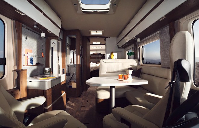 Phía sau buồng lái là một bộ bàn ăn có thể điều chỉnh cùng ghế sofa. Ghế lái và ghế phụ có thể xoay 360 độ để dùng bữa cùng gia đình hoặc bạn bè. Dọc trần xe là rất nhiều cửa sổ trời để đưa ánh sáng vào bên trong cũng hệ thống quạt thông gió.