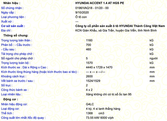 Theo thông tin đăng kiểm, Hyundai Accent mới vẫn có 4 phiên bản như trước. Kích thước và khối lượng xe không thay đổi. Động cơ vẫn là loại cũ. Công suất có nhỉnh hơn một chút nhưng không đáng kể. Động cơ 1,4 lít trên mẫu xe đang bán ra thị trường cho công suất 100 mã lực và mô-men xoắn 132 Nm. Hộp số vẫn có 2 tuỳ chọn số sàn 6 cấp hoặc tự động 6 cấp.