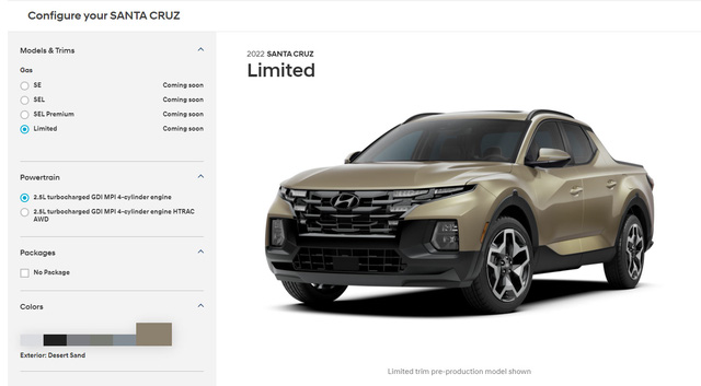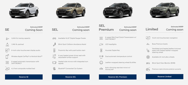 Trong khi biểu giá chi tiết xe vẫn chưa có, ít nhất ta có thể biết được chiếc bán tải Hyundai sẽ có 4 cấu hình từ thấp tới cao là SE, SEL, SEL Premium và Limited.