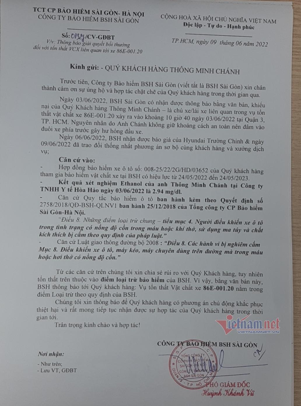 Tuy nhiên, ngày 9/6, phía bảo hiểm BSH Sài Gòn đã gửi Thông báo số 01327/CV-GĐBT do phó giám đốc Huỳnh Khánh Vũ ký, từ chối chi trả quyền lợi bảo hiểm của khách hàng Chánh. Lý do từ chối dựa trên kết quả xét nghiệm nồng độ cồn của khách hàng Khánh là đã vi phạm điều khoản loại trừ: “lái xe điều khiển xe trên đường mà có nồng độ cồn trong máu hoặc khí thở, sử dụng ma túy và chất kích thích bị cấm theo quy định của pháp luật”.