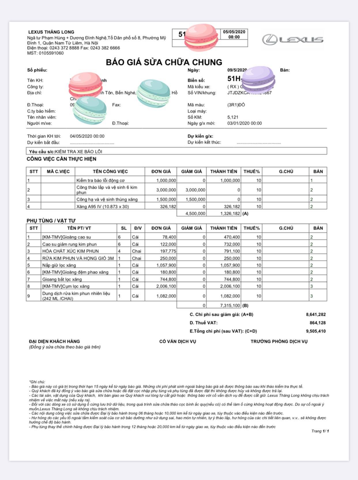 Trong khi đó, chiếc Lexus RX350L mặc dù trong thời hạn bảo hành nhưng phía đại lý Lexus lại đưa ra một bảng báo giá sữa chữa với nhiều hạng mục buộc khổ chủ sở hữu xe phải trả tiền. Tổng chi phí ước tính lên tới hơn 9,5 triệu đồng.