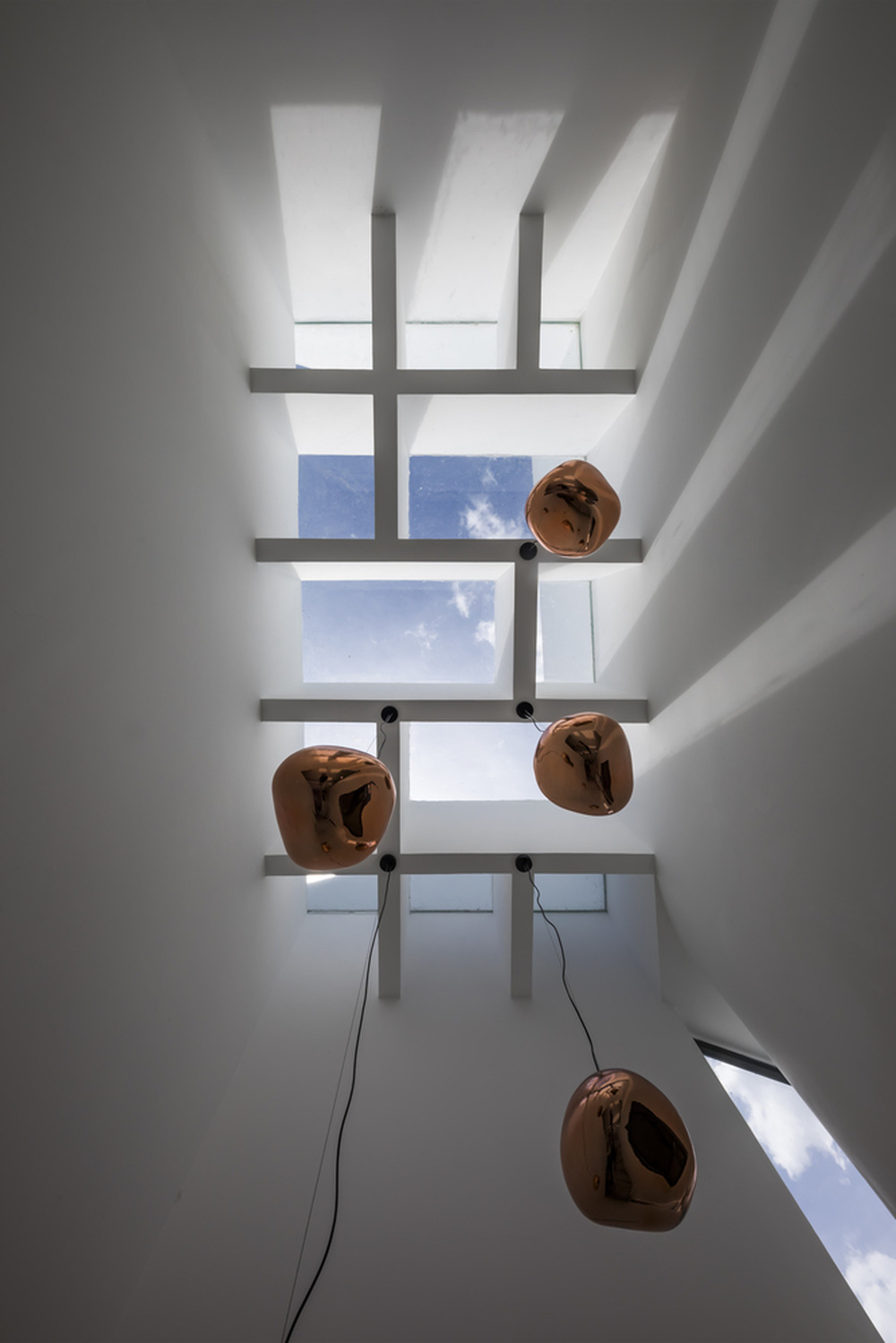 Cầu thang là điểm nhấn của ngôi nhà. Cầu thang cong kết hợp với khoảng thông tầng tạo cảm giác gọn gàng cho công trình.