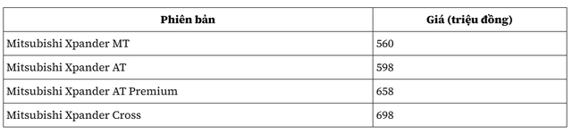 Với ưu đãi này, các mẫu Xpander MT, AT, AT Premium và Xpander Cross lần lượt giảm 28 triệu, 30 triệu, 33 triệu và 35 triệu đồng. Mức giá niêm yết của Mitsubishi Xpander các phiên bản như sau: